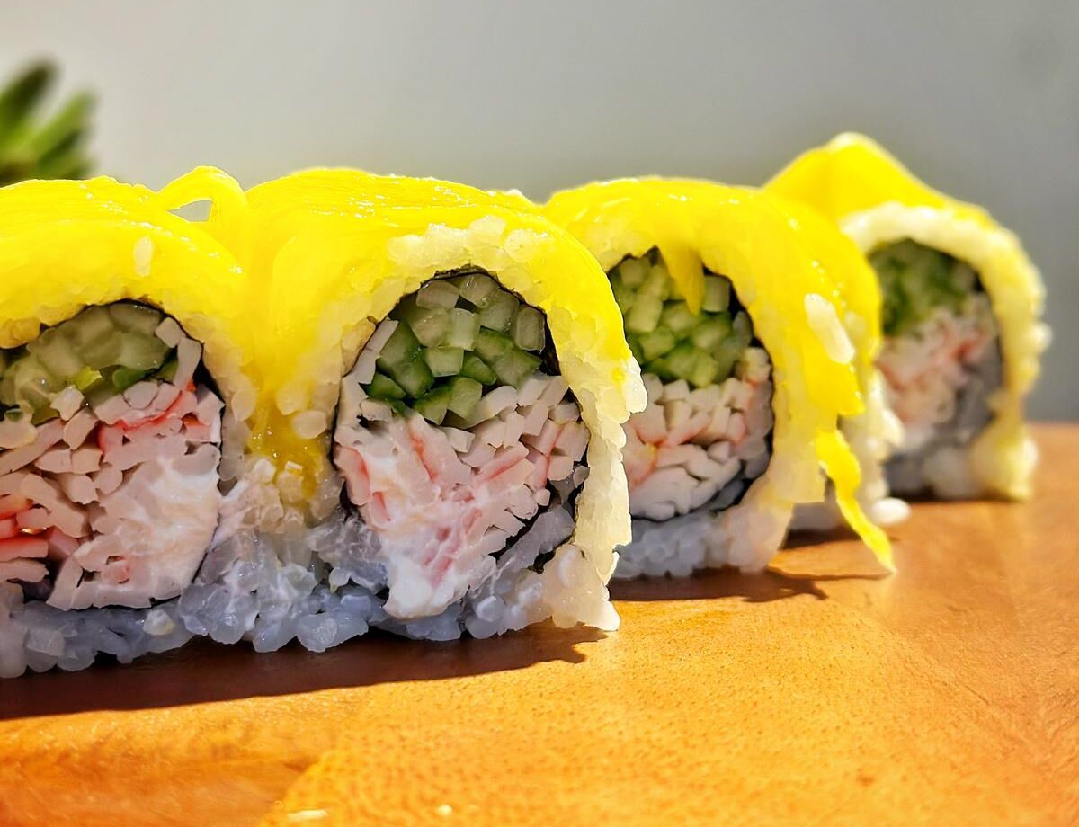 Cream cheese, crab (surimi), cucumber, topped with mango