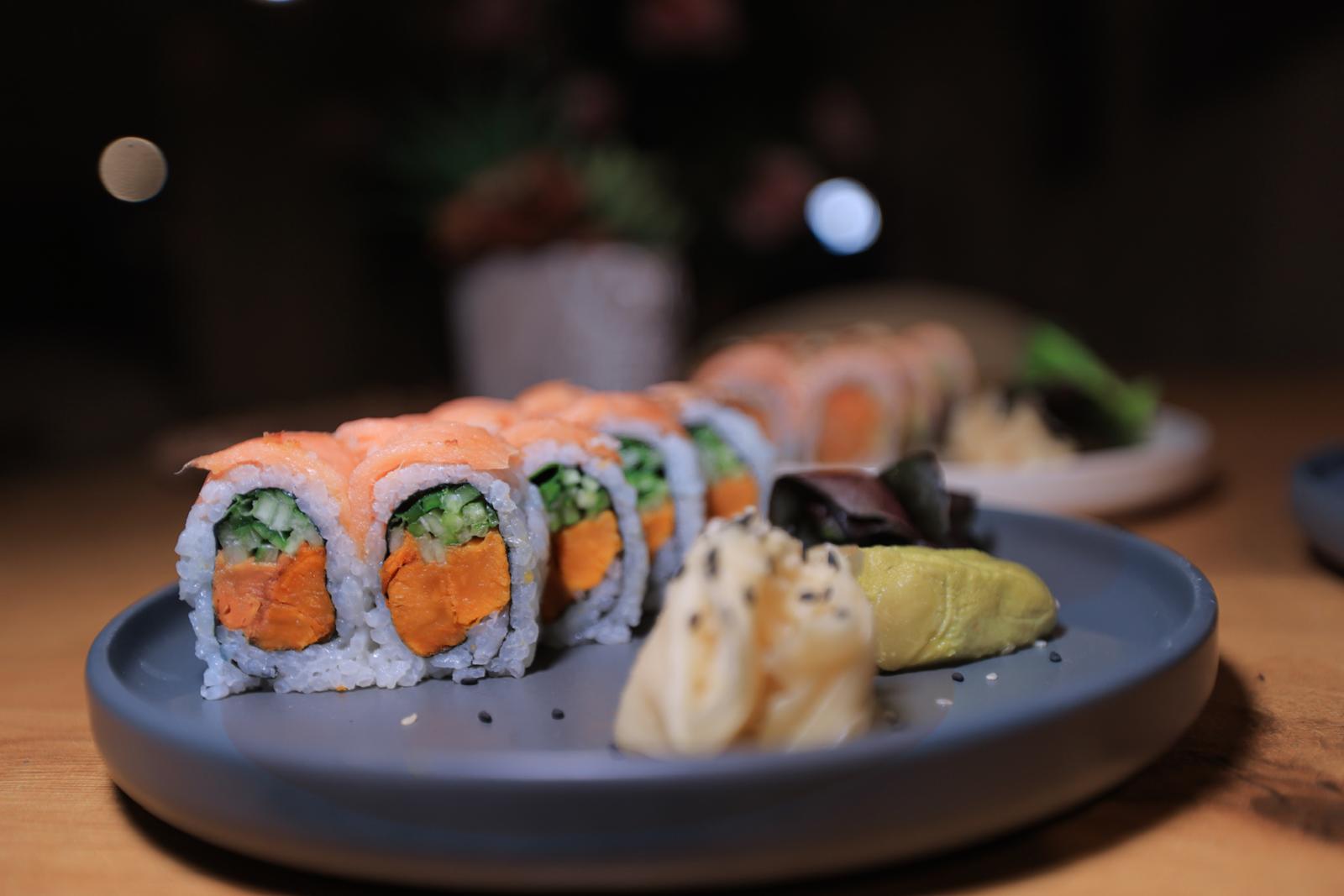 Filled with sweet potato, cucumber, green onion, and a touch of fresh mint, topped with smoked salmon.